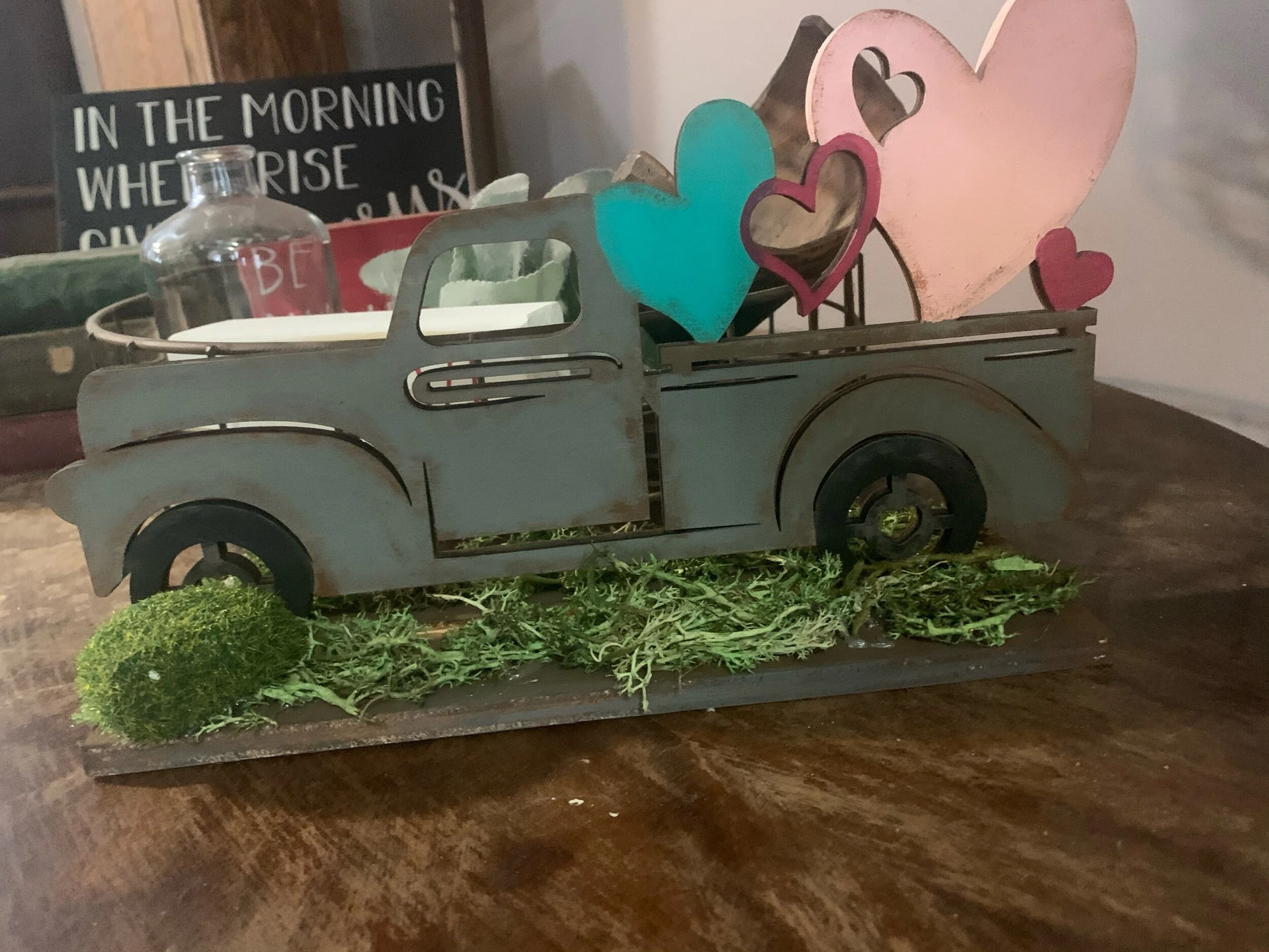 On to the truck. I painted the truck gray (not the hearts though) and the tires black. Then I decided to age the truck. Again dry brushing some brown and rust colored paint.